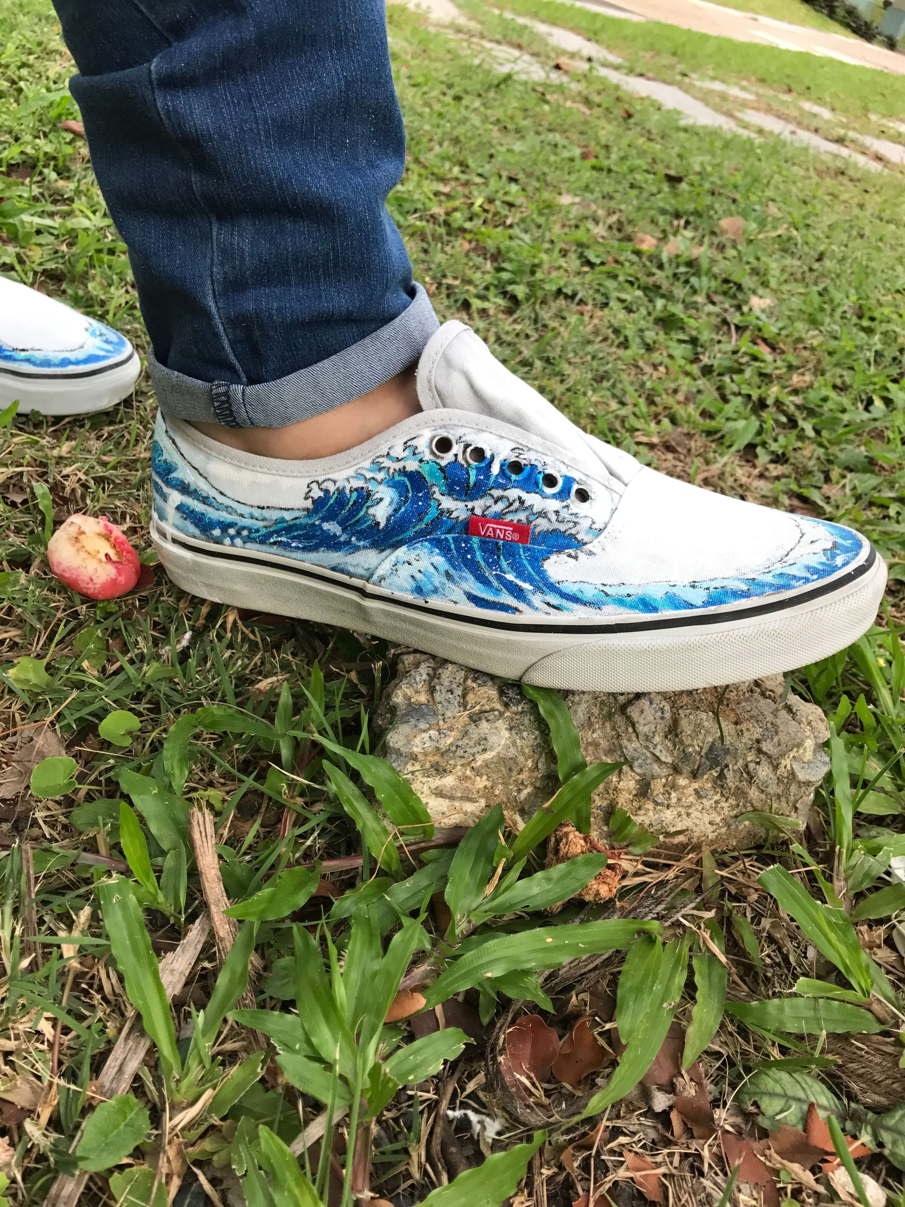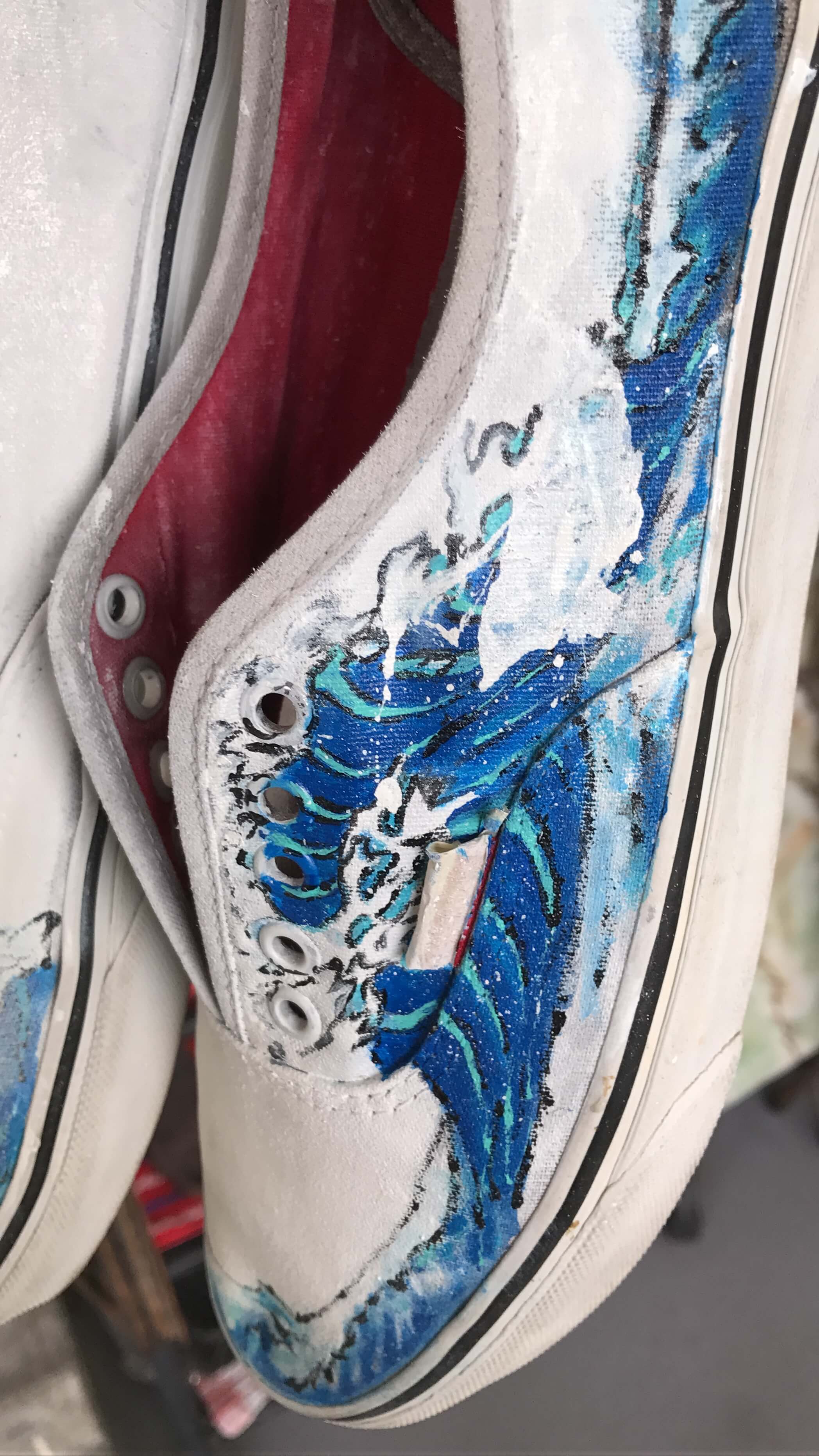 The first trial was supposed to be a disaster. We had no idea what we were doing. No proper leather paint. No resources. So what did we do? We grabbed our school's art and craft paints β the kind meant for canvases, not leather β and we started painting on a pair of old shoes we had lying around. We were expecting a total flop. Something to laugh about later, maybe. Instead? It was hot. It was the Great Wave off Kanagawa β that iconic Hokusai print, painted with the wrong materials on the wrong shoes. But somehow, it was absolutely right.