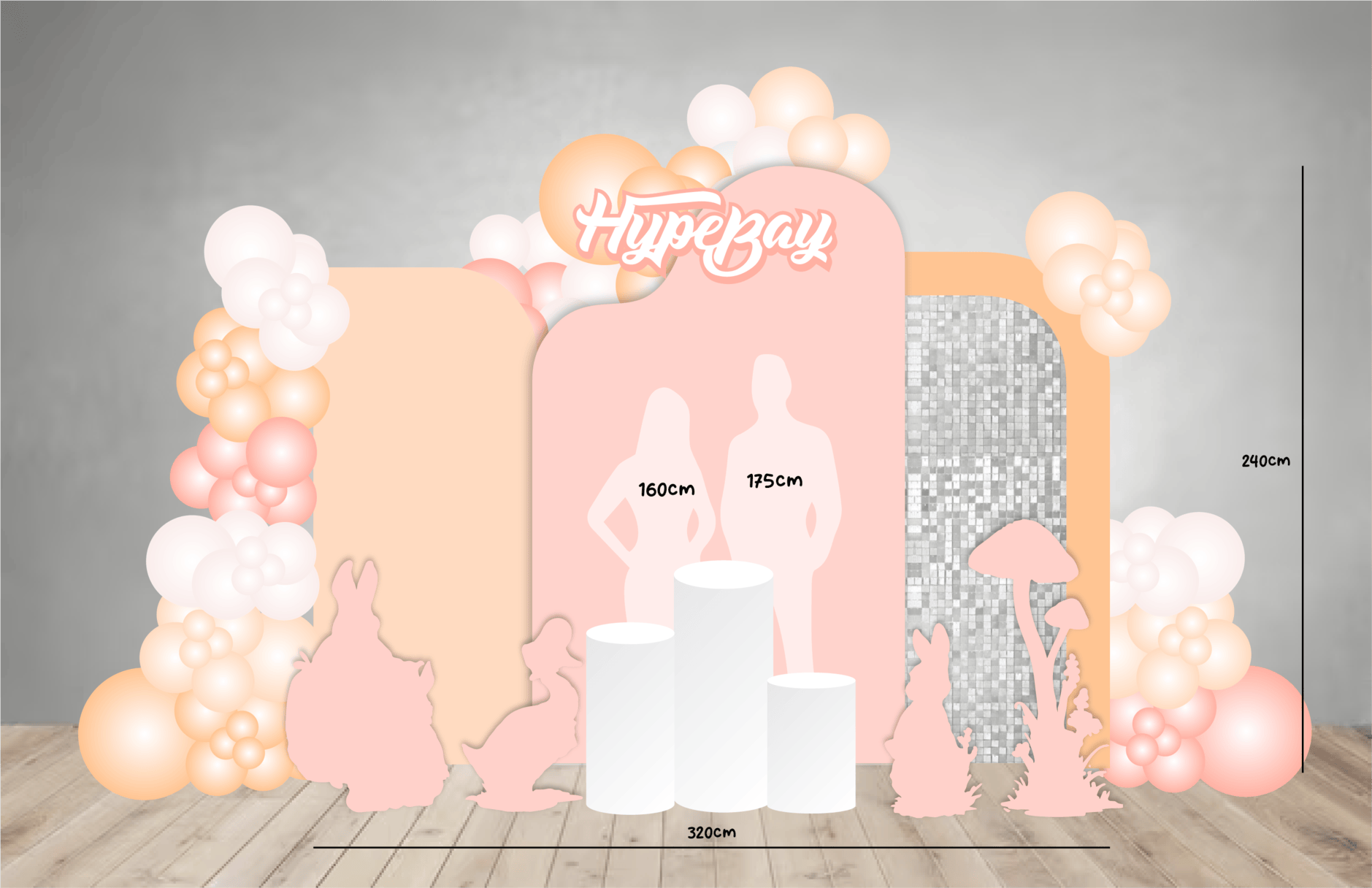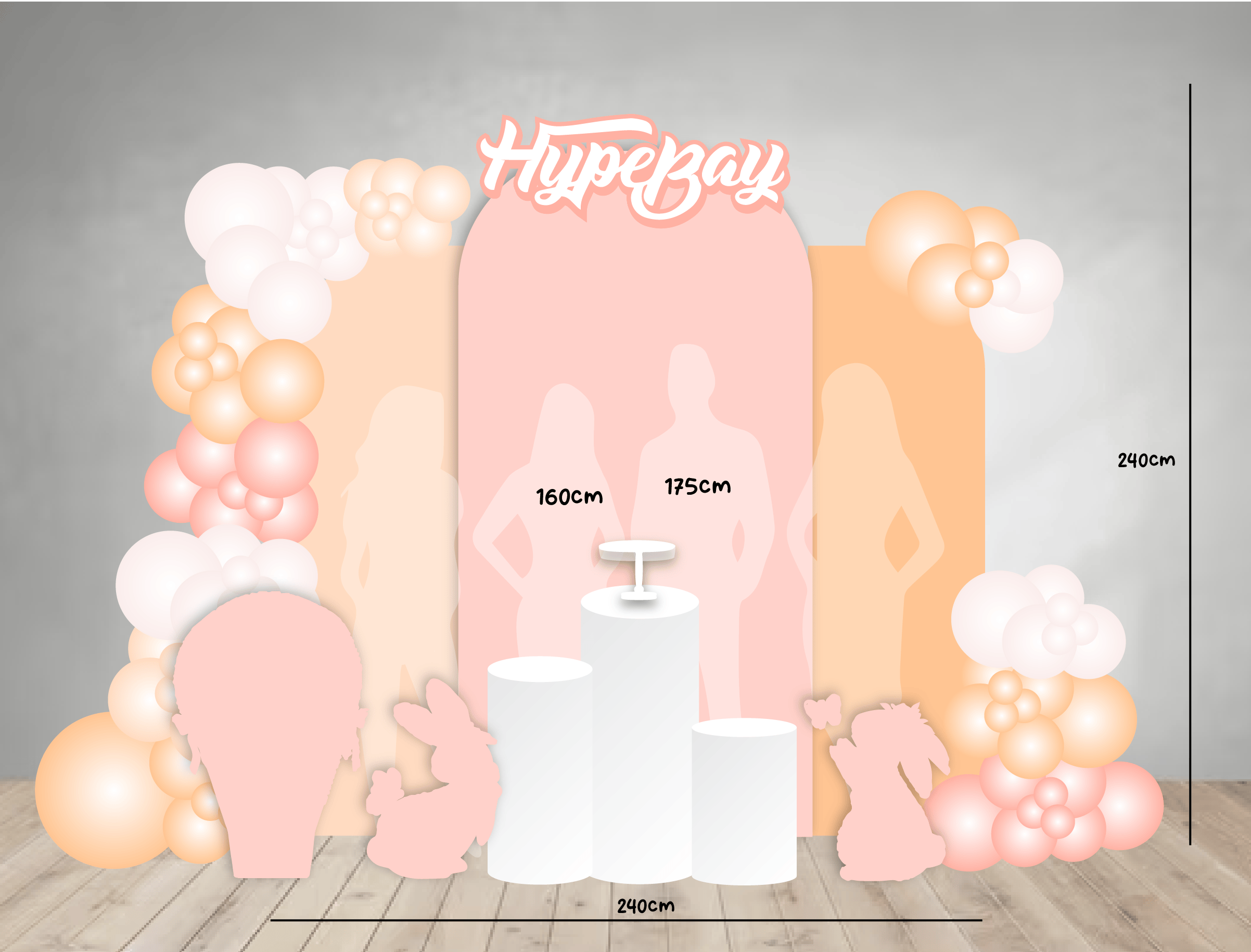 - ✓2 Customised backdrop (spanning 240cm x 240cm) or 1 center piece backdrop (240cm x 120cm) + 2 side pillars (60cm x 180cm)